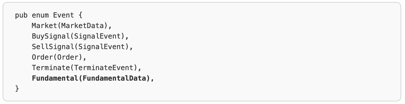 The other option is to extend the Market Data events and attach the fundamental data to it. While this does increase the coupling between two events, it doesn't make sense. For one, we won't have to implement an additional event handler; we could just re-use the existing architecture. Additionally, by coupling the two events, it would be trivial to create strategies that combine technical indicators with fundamental indicators. Let's say I wanted to do the Rate of Change of NVDA's price * the Rate of Change of NVDA's Income as an indicator. Coupling it introduces less challenges.
