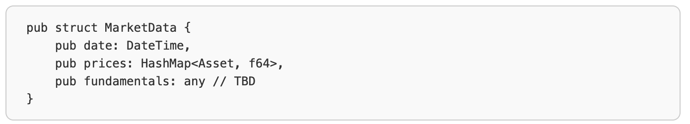 Now that we've figured out what event to attach the fundamental data to, we have to populate this for both backtesting and livetrading. Here's what the updated MarketData struct will look like.