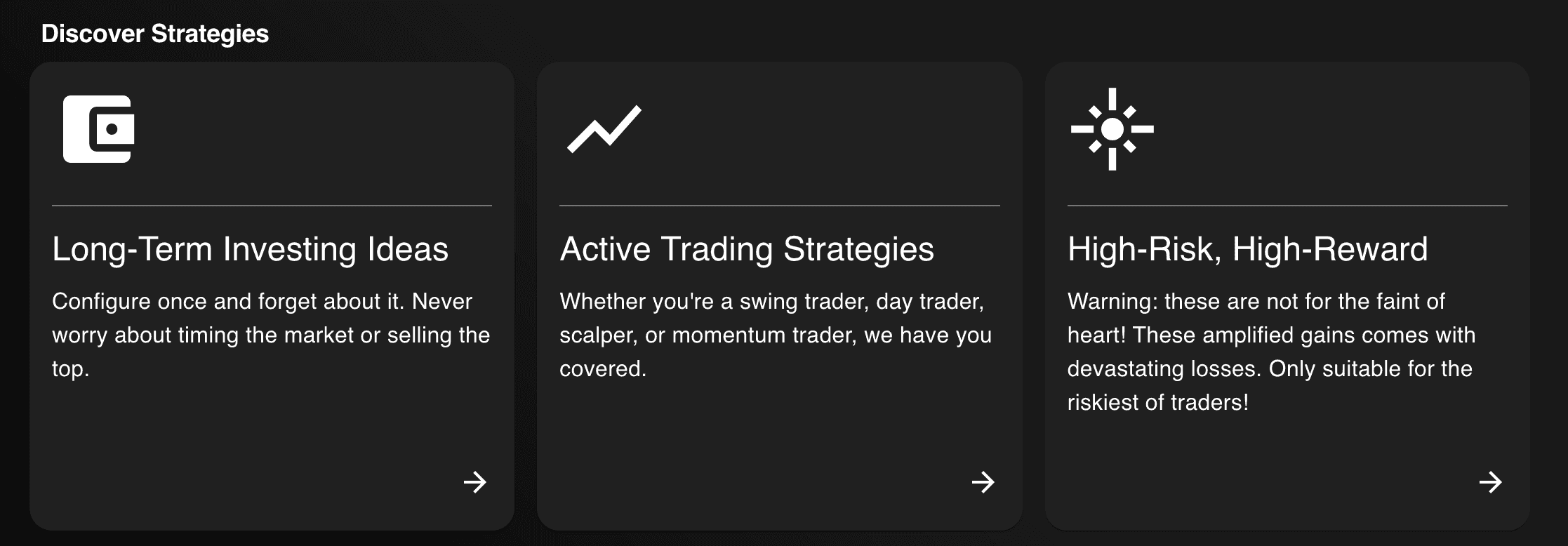 I rebuilt this experience, giving users a more useful dashboard for navigating through the app. Users can click on the Simple Stock Screener or their main portfolio, or they can choose to discover new algorithmic trading strategies.