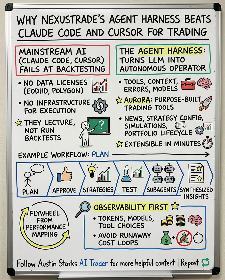 More concretely, there’s a reason why Claude, ChatGPT, Cursor, and OpenClaw fail to outperform NexusTrade when it comes to developing algorithmic trading strategies. It’s the harness.